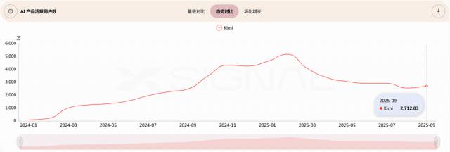 据 Xsignal(奇异因子)数据显示,截至 2025 年 9 月,Kimi 月活约 2700 万;前两名豆包与 DeepSeek 分别约 2.5 亿与 1.7 亿,量级差距被迅速拉开。而更刺眼的是结构性变化:在字节、腾讯系的"超级分发"夹击下,Kimi 的自然增长并未形成可替代的流量闭环。