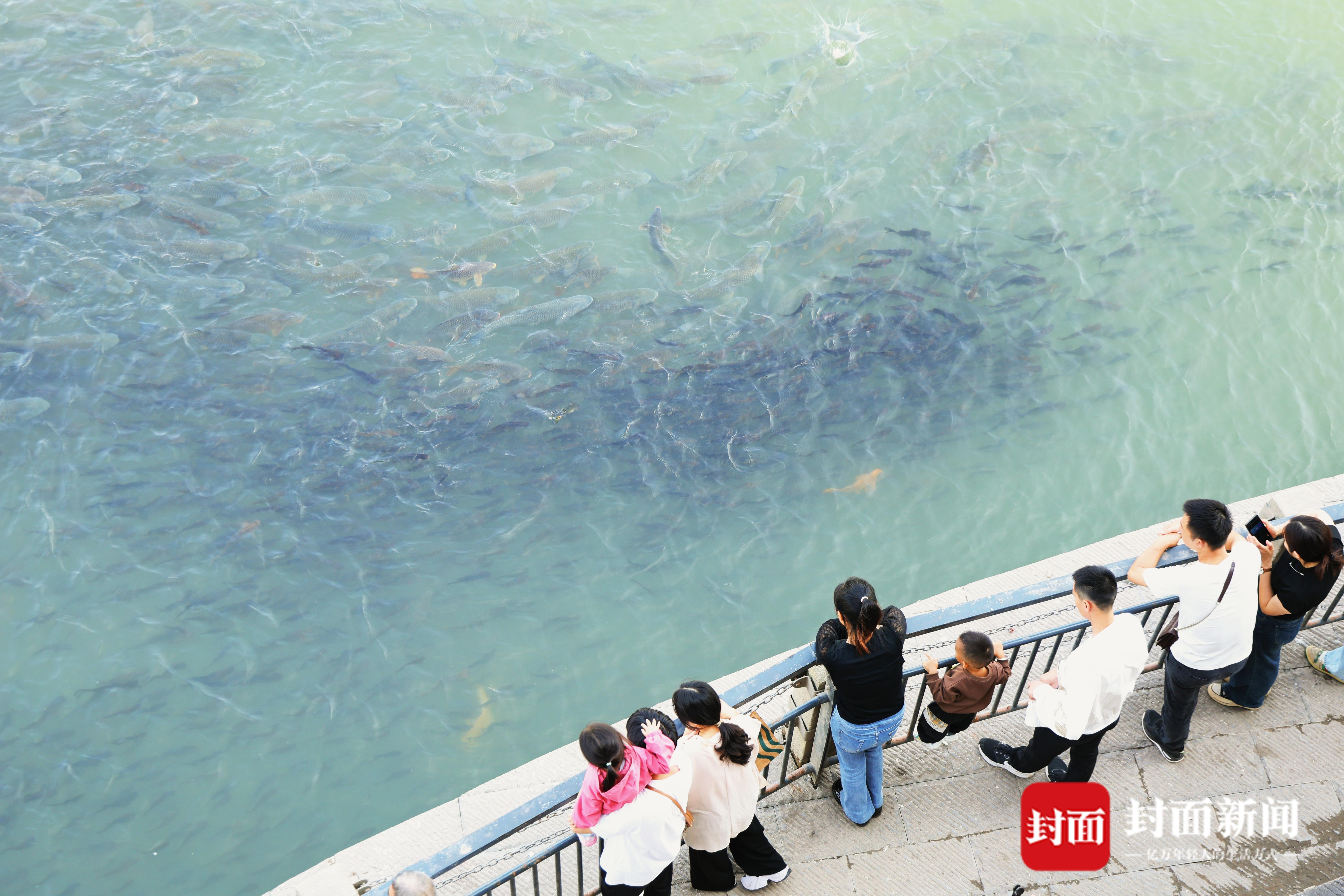 游客在四川省宜宾市翠屏区合江门喂“宠物鱼”。